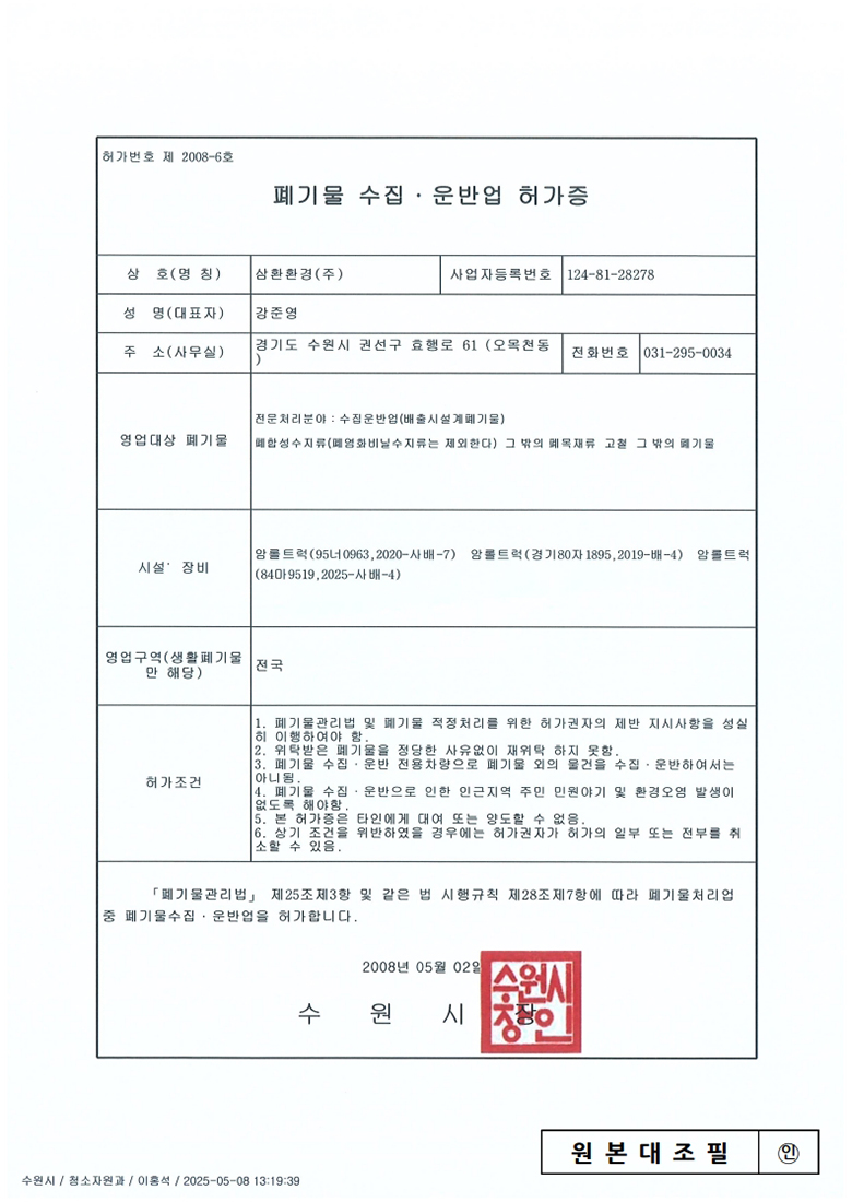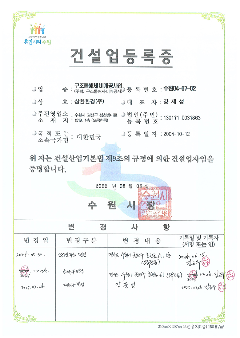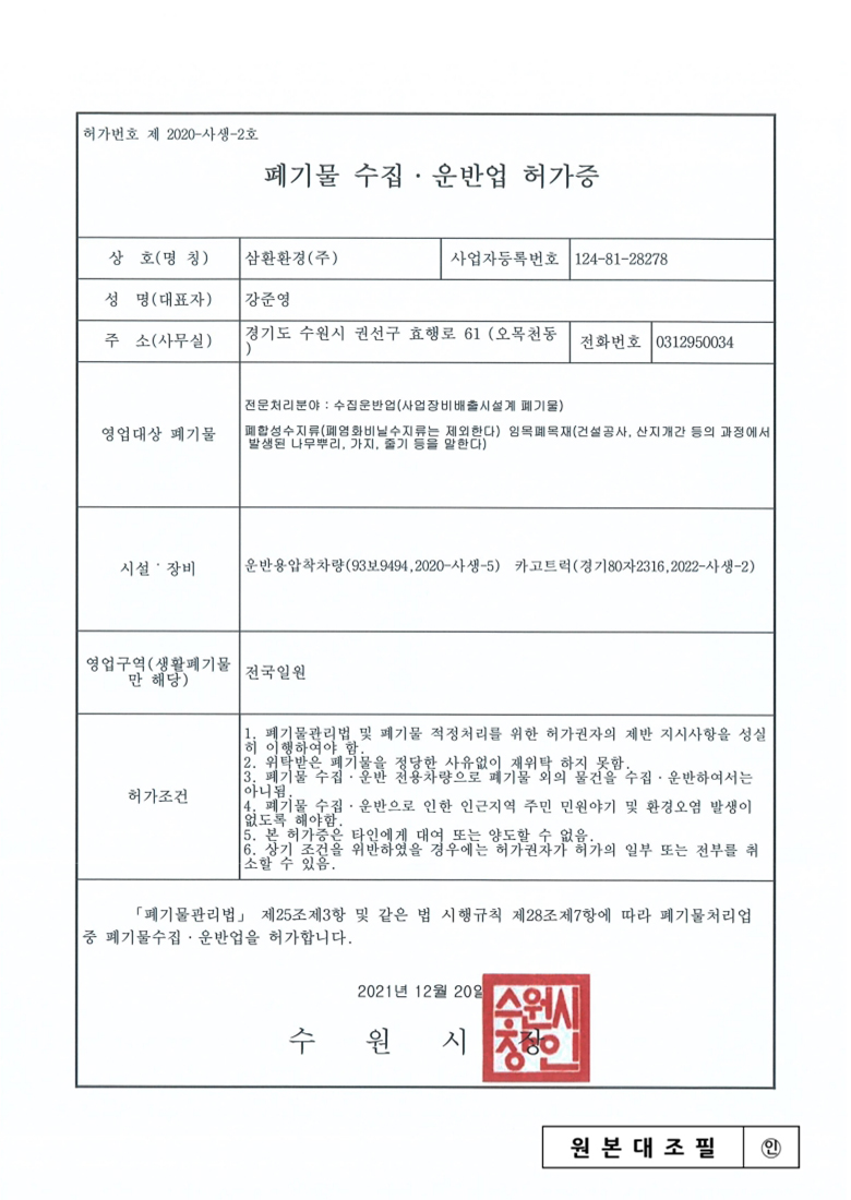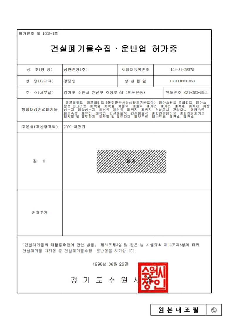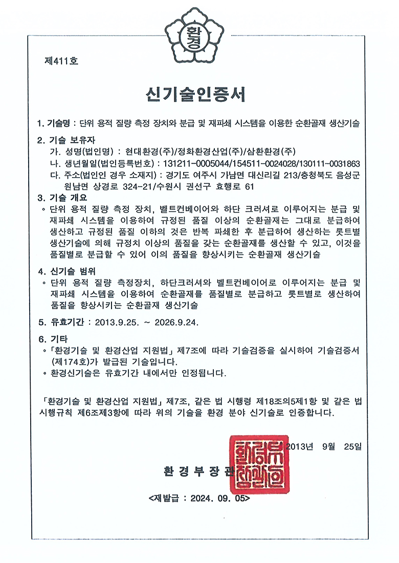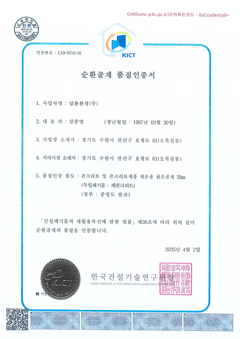 중간처리 및 건설폐기물수집운반, 순환골재 생산판매, 사업장폐기물 재활용 및 수집운반, 전문건설업, 공인계량증명업, R&D 친환경산업플랜트