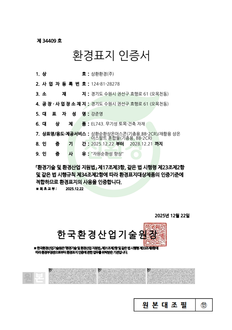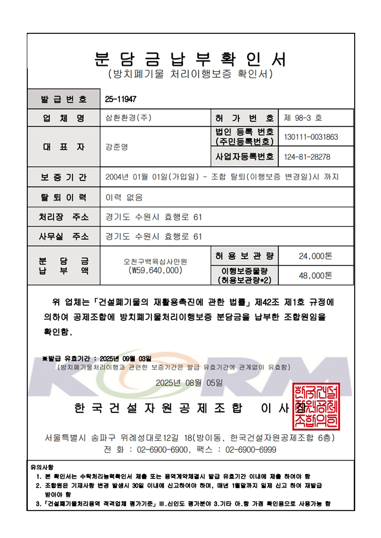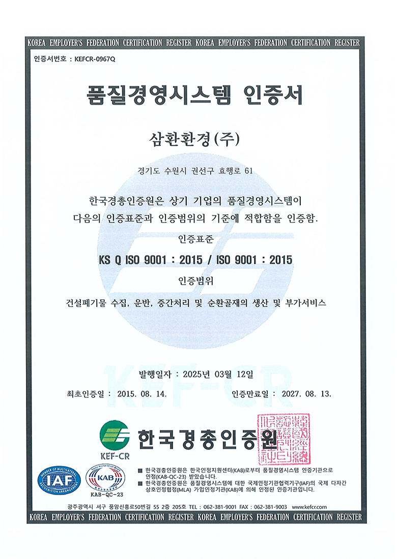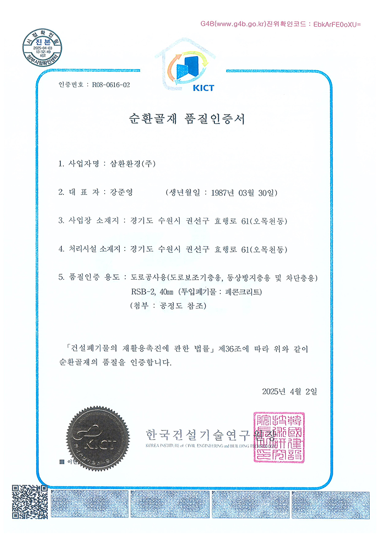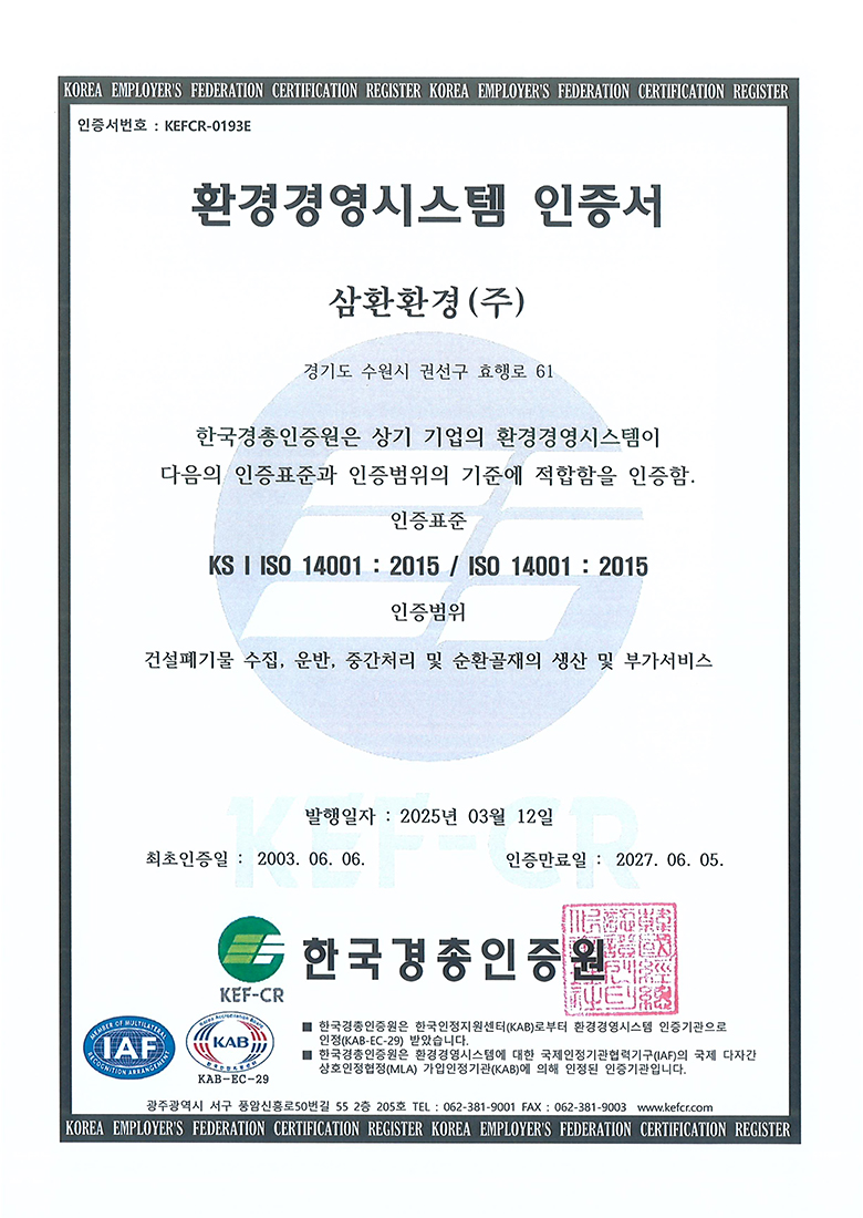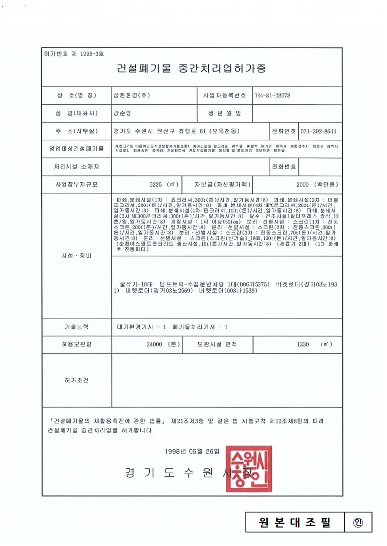 중간처리 및 건설폐기물수집운반, 순환골재 생산판매, 사업장폐기물 재활용 및 수집운반, 전문건설업, 공인계량증명업, R&D 친환경산업플랜트